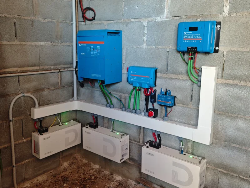 El sistema está compuesto por 6 módulos solares de 500 Wp (3.000 Wp totales), un inversor de 5 kW nominales y baterías de litio de 7,5 kWh de capacidad, que garantizan la disponibilidad de energía incluso durante la noche o en periodos prolongados sin sol.
