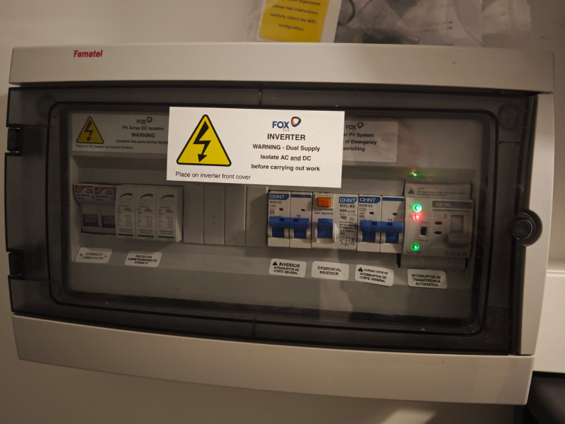 Además, la instalación cuenta con un sistema de respaldo (*backup*) con interruptor de transferencia automática, que evita cortes de suministro en caso de fallo de red, garantizando un funcionamiento continuo y seguro. Todo el sistema está legalizado bajo la modalidad de compensación de excedentes, lo que permite verter a la red la energía sobrante y obtener un ahorro adicional.